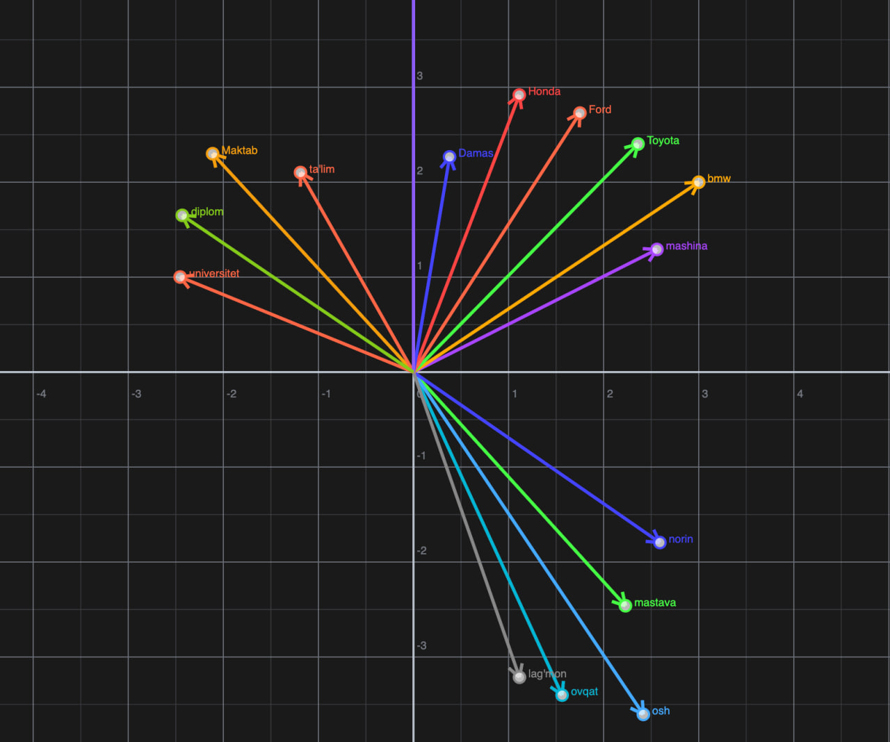 “Mushuk”, “It”, “Ot” so’zlarining nuqtalari fazoning bir burchagida to’planadi (Hayvonlar tarafida). “Mashina”, “Avtobus”, “Poyezd” esa butunlay boshqa burchakda to’planadi (Transport tarafida).